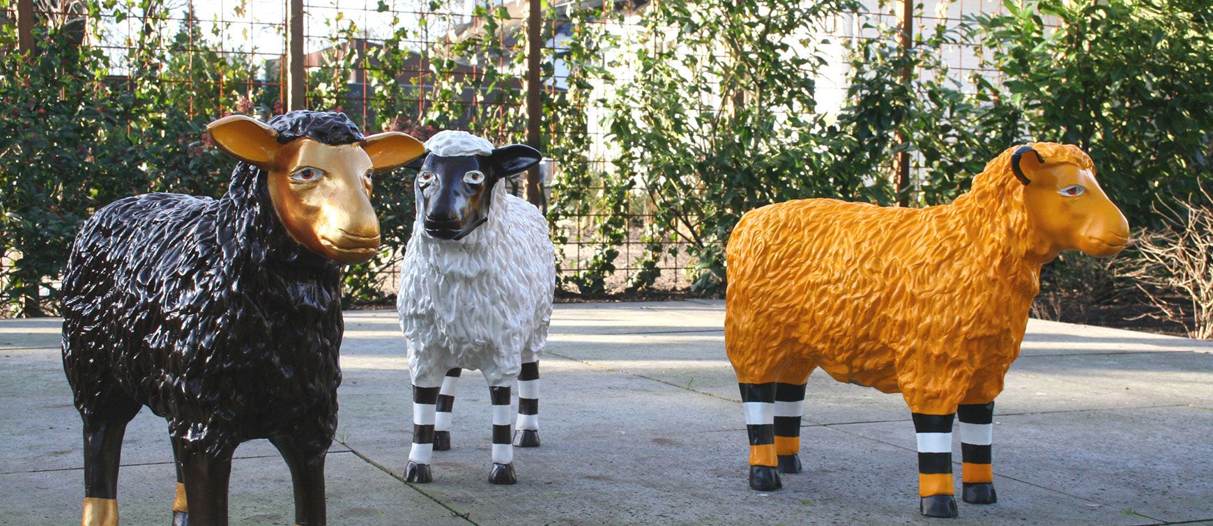 Onze schapen zijn gemaakt van polyester en met de hand beschilderd door de kunstenaar.
